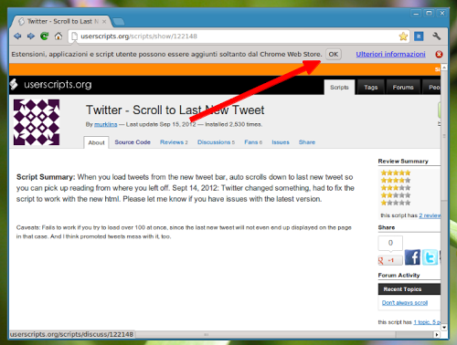 Una volta installato Tampermonkey su Google Chrome o Chromium potremo reinstallare gli script da userscript senza che questi siano bloccati.