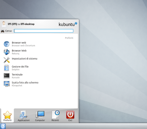 Di default KDE offre un menu completo, permette di accedere velocemente alle applicazioni preferite, accedere all’elenco suddiviso per le varie categorie oppure permette di effettuare ricerche mirate grazie anche alla barra di ricerca.