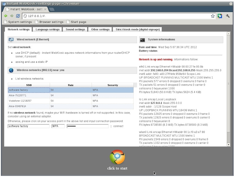 La nuova versione 2.0 di Instant WebKiosk aggiunge il supporto Wireless, la personalizzazione delle rete, lingua ecc è presente già all’avvio il tutto gestibile da una nuova scheda di Chromium. Instant WebKiosk 2.0 aggiunge anche informazioni sul sistema come data e ora, se utilizzato in dispositivi portatili lo stato della batteria ecc.