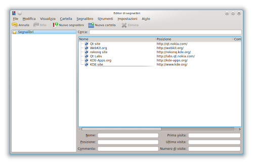 La gestione dei segnalibri di Rekonq è condivisa con quella di Konqueror e accessibile tramite l’editor dedicato il quale però non è collegato nel menu del browser.