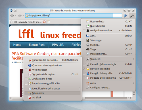 Per attivare la sincronizzazione da Rekonq basta andare su Strumenti e poi in Sincronizza.