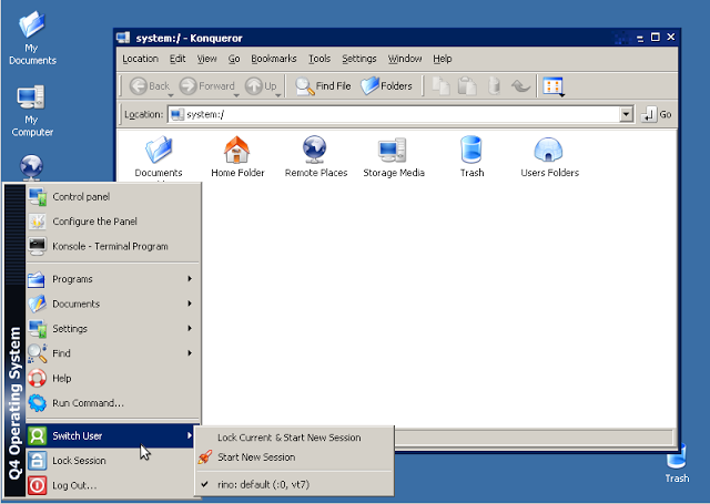 Q4OS è una nuova distribuzione basata su Debian con sopra KDE che ricorda molto windows, non ancora recensita da Distrowatch.com ma che risulta essere già in attesa. Usa un kernel 2.6.32 con KDE 3.5.13 ed attualmente è allo stato di test beta 1, nasce con l’intento di creare una distribuzione stabile, efficiente, leggera che renda disponibili delle API stabili per la creazione di applicazioni di terze parti.