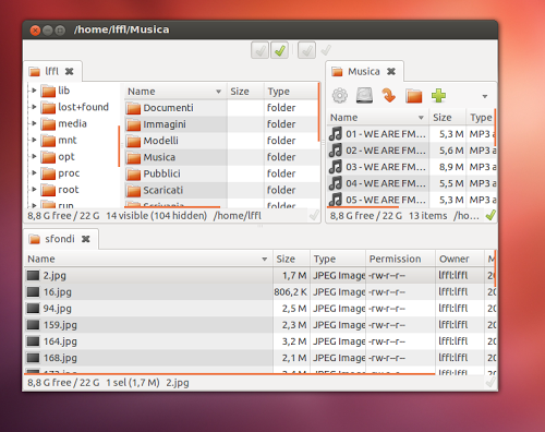 SpaceFM supporta la visualizzazione in schede e pannelli multipli le quali ci permettono di accedere con facilità a cartelle e partizioni e copiare o spostare fine all’intero di esse.