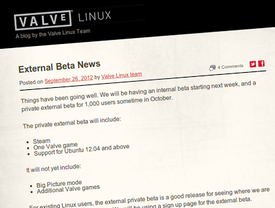 La prima beta di Steam per Linux includerà solo un gioco, che sarà probabilmente Left 4 Dead 2 (anche se il post non menziona il nome del gioco) per gli altri giochi come avevamo già anticipato dovremo aspettare febbraio 2013. Non sarà presente nemmeno la modalità Big Picture nuova funzionalità dedicata all’utilizzo di Steam sui televisori di nuova generazione. Valve ha confermato che oltre al supporto per Ubuntu 12.10 Quantal la beta sarà supportata anche da Ubuntu 12.04 Precise LTS.