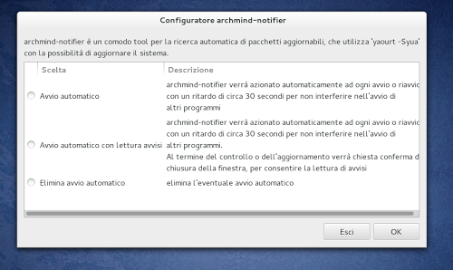 Il tool archmind-notifier avvia una semplice finestra di dialogo nella quale possiamo attivare la ricerca di nuovi aggiornamenti ad ogni avvio di Arch Linux (dovrebbe funzionare anche su Chakra).