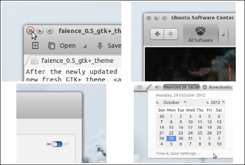 Rivisitato anche il tema per Faience per Gnome Shell, il quale porta alcune correzioni per integrarsi al meglio con Gnome Shell 3.6, il tema e il colore dei vari applet richiama il tema Gtk+ delle finestre. Il tema Faience è presente nei PPA del set d’icone Faenza e Faince, se abbiamo già installato il set d’icone basta cercare il tema su Ubuntu Software Center