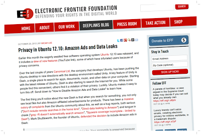 L’arrivo del Lens Shopping ha portato un sacco di polemiche da parte della comunità Ubuntu ma anche di molti siti web. Se ne occupata in questi giorni anche l’Electronic Frontier Foundation (EFF) la famosa organizzazione internazionale non profit che si occupa della tutela dei diritti digitali e della libertà di parola nel contesto dell’odierna era digitale.