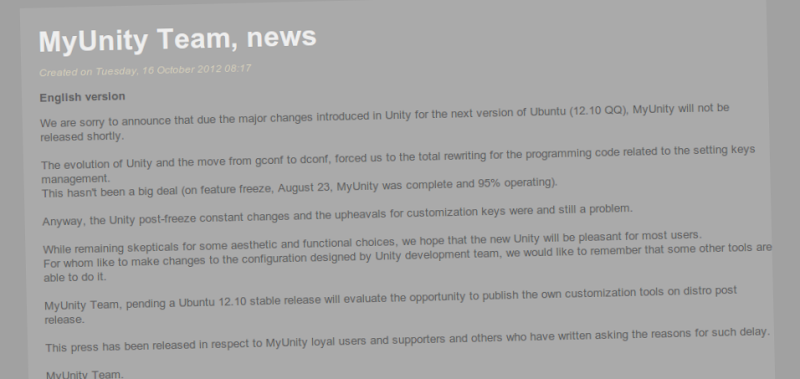 Il tanto atteso rilascio di MyUnity 4.0 di cui avevamo già parlato nei mesi scorsi ha portati diversi ritardi nello sviluppo della distribuzione a tal punto che non sarà disponibile per Ubuntu 12.10 Quantal.