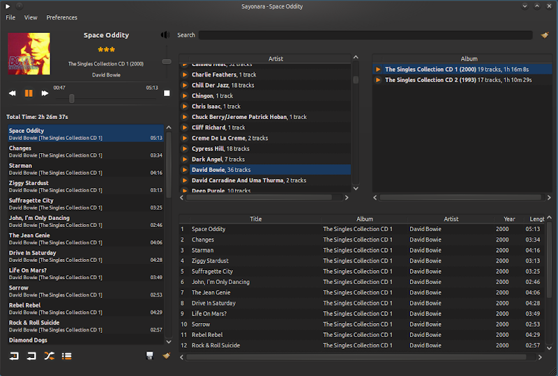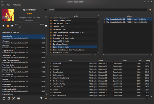 Scritto in C++ e Qt si basa su GStreamer e il plugin phono, il player Sayonara offre un’interfaccia grafica studiata per gestire al meglio la nostra collezione musicale, oltre ad offrire i brani in riproduzione, troviamo anche l’accesso veloce alla playlist, artista e album oltre una barra di ricerca in alto per effettuare velocemente ricerche mirate.