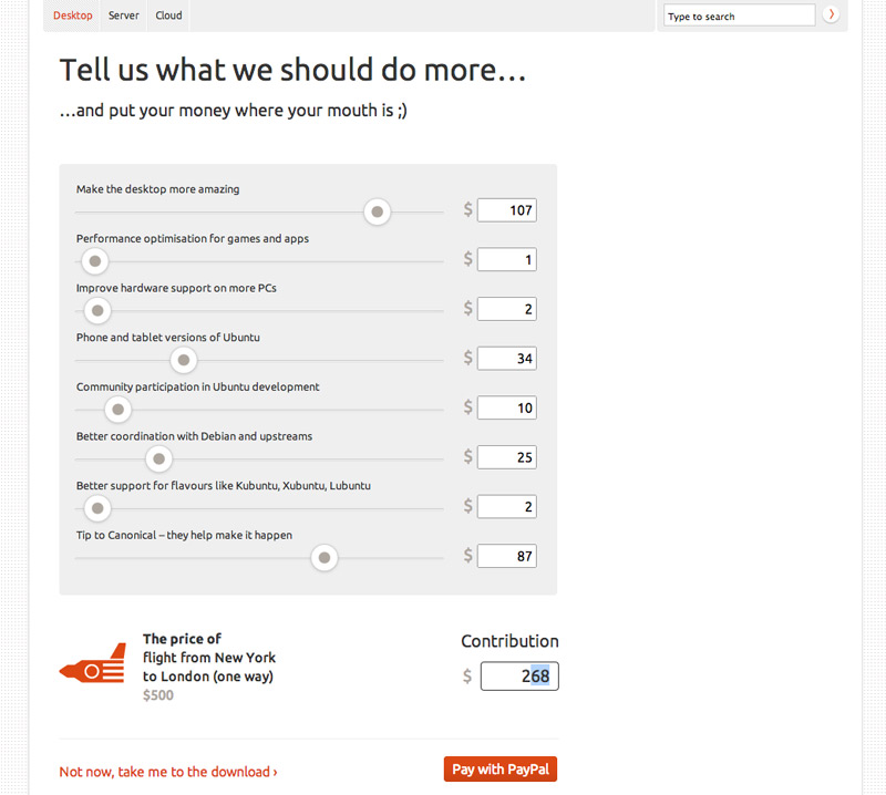 La nuova pagina delle donazioni permette di versare soldi ai settori preferiti che vanno dal desktop (sviluppo di Unity), a ottimizzare lo sviluppo dei giochi e applicazioni, a migliorare il supporto hardware, al supporto per smartphone e tablet, alla comunity Ubuntu, alla coordinazione con Debian, al supporto per le derivate come Kubuntu, Xubuntu e Lubuntu o al progetto di Canonical.