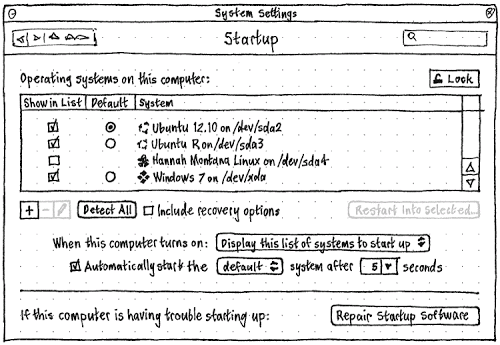 L’idea degli sviluppatori di Canonical è quella di offrire un tool sul quale operare sul Grub attraverso una semplice interfaccia grafica. Le prime bozze del progetto Startup Settings (come possiamo vedere dalle immagini nell’articolo) ci fanno notare come possiamo gestire i vari sistema operativi (e in caso di distribuzioni Linux anche i rispettivi kernel, ecc) modificarne la lista di visualizzazione e il tempo d’avvio.
