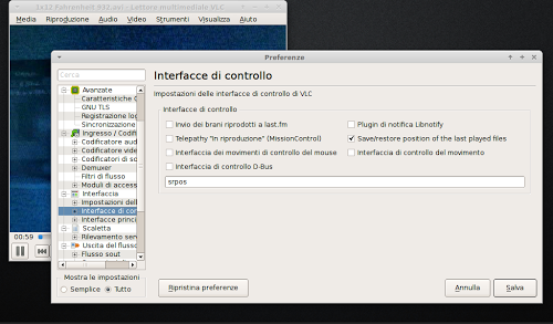 A questo punto basta avviare VLC e andare in Strumenti e poi in Preferenze, clicchiamo in basso su mostra le impostazioni -> tutto e clicchiamo su Interfaccie e poi su Interfacce di controllo e spuntiamo in Save/restore position of the last played files e clicchiamo su Salva.