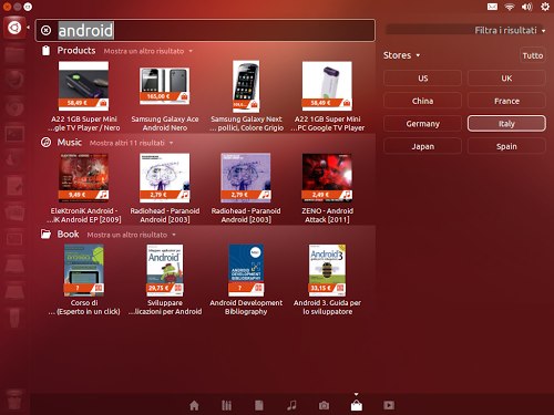 terminiamo la sessione o riavviamo Ubuntu ed ecco il nuovo Lens Shopping Amazon Alternate presente sul nostro Dash.