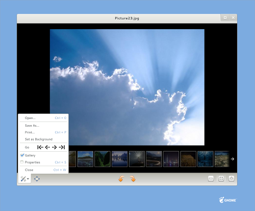 Il team Gnome Design ha pensato d’integrare il menu nella barra del titolo di Eye of Gnome aggiungendo le funzionalità presenti nel menu contestuale oltre alla visualizzazione delle miniature delle immagini recenti, l’impostazione dell’immagine come sfondo ecc.