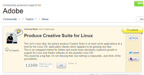 Dal portale GetSatisfaction da alcuni anni è presente una raccolta di preferenze per portare all’attenzione la proposta di avere Adobe Creative Suite in Linux.