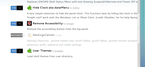 Alcune estensioni disponibili per Gnome 3.4 non funzionano più dopo l’aggiornamento, se andiamo nella pagina dedicata del portale Gnome Extensions noteremo la dicitura Outdate con l’estensione sfuocata.