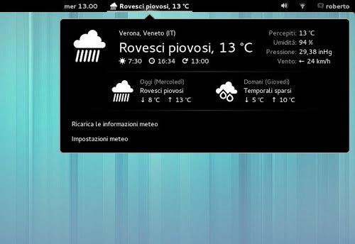 Attraverso GNOME Shell Weather Extension avremo molte funzionalità integrate, l’estensione ci permette di consultare più località, configurare le varie informazioni indicando quale unità di misura utilizzare per la temperatura, intensità vento, pressione atmosferica.