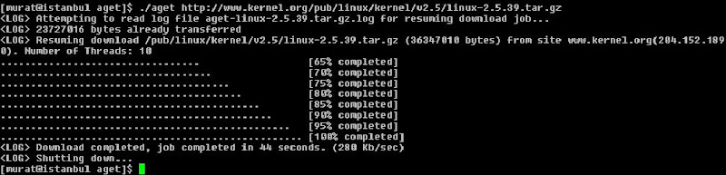 Basta semplicemente digitare da terminale aget seguito dal link del download e premere invio, durante il download Aget ci offrirà informazioni sul processo dalla velocità in tempo reale al tempo previsto per terminare il download.