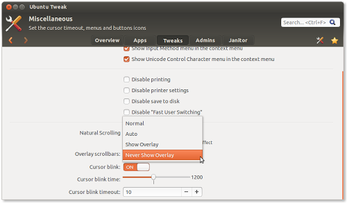 Ubuntu 12.10 porta con se una caratteristica nascosta denominata “Touch Mode” per la sovrapposizione delle barre di scorrimento. Ubuntu Tweak 0.8.3 aggiunge la possibilità di attivare la funziona “Never Show Overlay” dalla sezione Tweaks -> Miscellaneous permettendo quindi la sovrapposizione delle barre di scorrimento