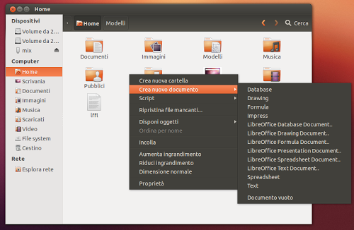 Fatto questo basta cliccare con il tasto destro del nostro file manager e andare in Crea oppure Crea un Documento e scegliere il formato il modello di documento da creare.
