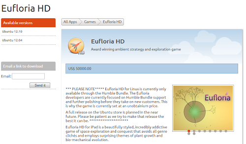 Interessante è l’acquisto di un gioco indie integrato da poco approdato su Ubuntu Software Center e denominato Eufloria HD il quale ha costo di solo 50000 dollari (circa 38200 Euro).