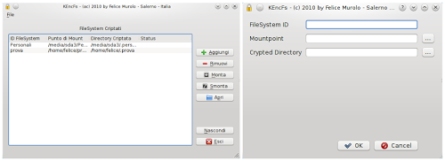 KEncFS è un’ottima GUI di EncFS, realizzata da uno sviluppatore italiano, attraverso la quale possiamo creare, montare, smontare ed eliminare un filesystem criptato.