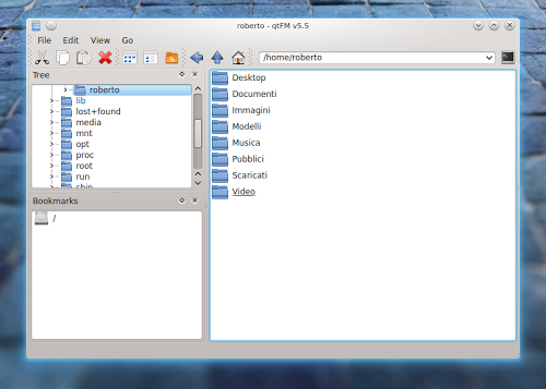 L’interfaccia grafica di qtFM è studiata per accedere velocemente alle varie cartelle e file, interessante le 3 finestre una dedicata alla normale navigazione mentre le altre offrono la vista ad albero e l’accesso alle cartelle preferite / Bookmarks, ottimo anche il collegamento per avviare velocemente il terminale nella cartella preferita. Possiamo inoltre personalizzare l’interfaccia grafica conforme le nostre preferenze possiamo ad esempio modificare la barra degli strumenti, varie visualizzazioni ecc.