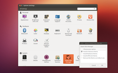 Steam Skin Manager viene fornito con due Skin di default: Ambiance e Radiance che permettono a Steam d’integrarsi al meglio con i temi di default di Ubuntu.