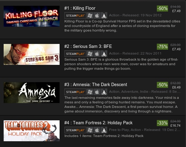Sono molti i giochi disponibili per Steam per Linux scontati da Valve anche del 75% tra i titoli più famosi troviamo Serious Sam 3: BFE a 6.99 Euro (al posto di 27,99€), Team Fortress 2 (Holiday pack) a 16,74€ al posto di 24,99€, World of Goo – Was a 2,24€ al posto di 8,99 e Killing Floor 8,99€ e molti altri ancora.