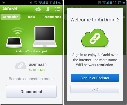 AirDroid 2 è aggiunge la modalità “Remote Connection Mode” che permette agli utenti di accedere al contenuto dei loro dispositivi su internet da qualsiasi luogo nel mondo oltre che alla modalità di connessione Wi-Fi tutt’ora disponibile nell’applicazione. Potremo quindi connetterci ad AirDrioid 2 utilizzando la connessione mobile accedendo sempre da remoto dal nostro browser logicamente la gestione il download e caricamento di file ecc saranno più lenti confronto la connessione Wifi dalla rete di casa.