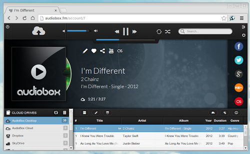Particolarità di AudioBox è il supporto per molti servizi web quali Dropbox, Google Drive, Skydrive, Box.net, YouTube, SoundCloud ecc.