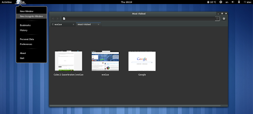 Particolare l’interfaccia di Web quando si accede alla modalità incognito che diventa nera, per accedere a questa funzionalità basta andare nel menu del browser dal collegamento nel pannello di Gnome Shell.