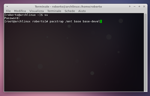 successivamente potremo creare una partizione nel nostro sistema utilizzando Gparted o da riga di comando cfdisk, montare la partizione e installare il sistema base digitando: