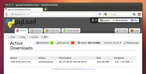 Avviamo il nostro browser e inseriamo il link per accedere a pyLoad (nel mio caso 0.0.0.0:8.0.0.1) e inseriamo il nostro user e password. A questo punto basta andare in Add a inserire i link e la cartella dove verranno scaricati. Una volta inseriti i link partirà il download automaticamente potremo chiudere la scheda del nostro browser senza problemi. Al termine del download troveremo i file nella cartella indicata.