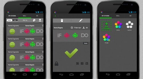 Atooma è un’applicazione ancora in fase di sviluppo nata principalmente per facilitarci la nostra vita attivando ad esempio il vivavoce quando entriamo nell’auto, inserire la vibrazione quando andiamo a lavorare o entriamo in luoghi pubblici ecc, inviare sms quando siamo a casa oltre ad integrare anche con vari social network come Facebook e Twitter oppure operare su file in spazi web su Dropbox, Google Drive ecc.