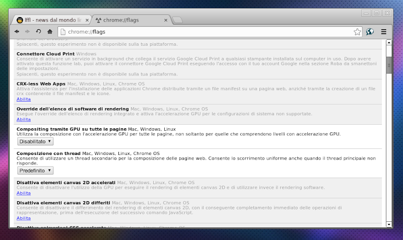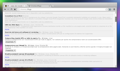 e disabilitiamo l’opzione “Compositing tramite GPU su tutte le pagine” e riavviamo il nostro browser.