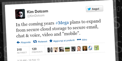 In un recente tweet Kim Dotcom ha annunciato che stà per arrivare in Mega la nuova chat, il nuovo servizio secure mail e Voice anche se non troviamo maggiori informazioni riguardanti le caratteristiche delle nuove funzionalità.