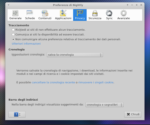 In Mozilla Firefox Night potremo inviare la richiesta nei siti web di voler o meno essere tracciati (di default non effettueremo alcuna comunicazione con i siti web) dalle impostazioni della cronologia invece potremo accettare o meno i cookie dei siti o di terze parte, disattivare il salvataggio della cronologia di navigazione, download, ricerche e moduli ecc.