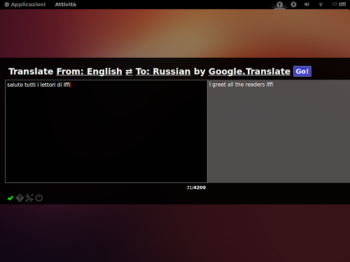 Text Translator aggiunge un collegamento nel nostro pannello, basta un click su di esso per avviare una finestra di dialogo dalle quale inserire il testo da tradurre e la lingua che vogliamo effettuare la traduzione. Dalle preferenze di Text Translator oltre al servizio web da utilizzare possiamo anche personalizzare le varie scorciatoie da tastiera, possiamo ad esempio tradurre un testo copiato da una pagina web facendo copia e digitando Super + Shift + t, con Ctrl + Shift + c potremo copiare la traduzione negli appunti / clipboard e molto altro ancora.
