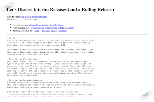 La proposta è stata successivamente smentita (o meglio ancora non accolta) da Jono Bacon spiegando che rendere Ubuntu una rolling release avrebbe portato un cambio radicale della distribuzione e tutto questo non poteva accadere adesso visto lo sviluppo di Ubuntu Touch.