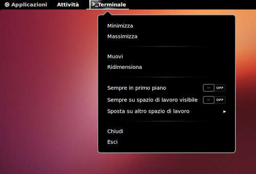 Dalla panoramica delle attività potremo avviare una finestra minimizzata passarla nei vari spazi di lavoro oppure chiuderla. Possiamo inoltre avere alcune opzioni della finestra cliccando con il tasto destro del mouse nella barra del titolo dal menu potremo avere la finestra sempre in primo piano, trovare la stessa finestra per ogni spazio di lavoro oppure spostarla in un’altro spazio di lavoro.
