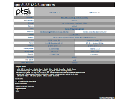 Per effettuare il test Larabel ha scelto un laptop HP EliteBook con processore Intel Core i5 Sandy Bridge 2520M da 2.20Ghz con una scheda grafica Intel HD Graphics 3000, 4Gb di Ram e una SSD Intel da 160 Gb nel quale è stato installato openSUSE 12.2 e il nuovo 12.3 nella versione livecd con ambiente desktop Gnome.