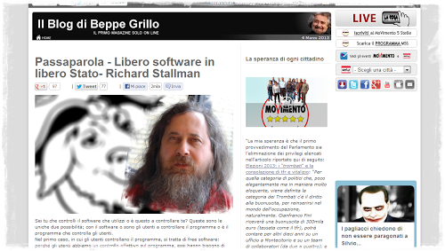 Uno dei blog più visitati in Italia è quello di Belle Grillo il famoso comico e politico genovese a capo de M5S attualmente il primo partitolo politico in Italia. In queste ore è apparso nel blog di Beppe Grillo un’interessante post su Richard Stallman e le qualità del software libero.