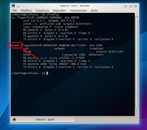 Riavviamo la nostra distribuzione e al riavvio diamo ancora il comando ifconfig per verificare il corretto cambio del Network Adapter Name