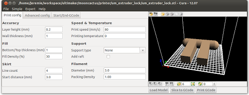 Cura attraverso una semplice interfaccia grafica ci permette di configurare una stampante Ultimaker, caricare e visualizzare un’anteprima del modello 3D con la possibilità di scalarlo (aumentarlo o rimpicciolirlo in scala) o posizionarlo in maniera diversa.