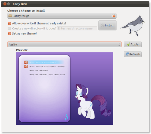 Early Bird è un’applicazione, scritta in Mono, con la quale possiamo installare facilmente un tema nel bootloader GRUB compresa la nuova versione 2.0 stabile.
