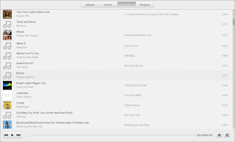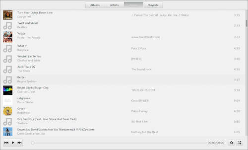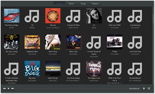 GNOME Music si divide in 4 sezioni: album, artisti, brani e playlist accessibili dai pulsanti in alto offrendo all’utente di cercare facilmente i brani preferiti nella propria collezione musicale.