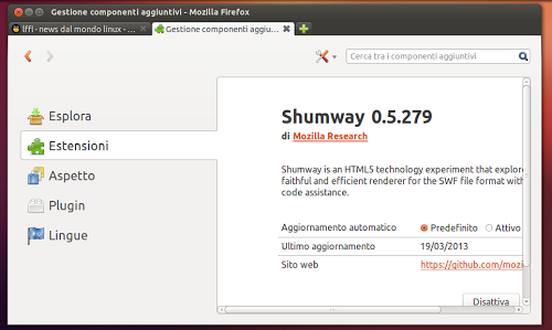 Per installare Shumway su Mozilla Firefox per prima cosa dovremo disattivare il plugin Flash Player dalla sezione dedicata alla gestione dei plugin del browser, fatto questo basta scaricare il plugin Shumway da questo link.