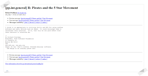 “I think it is appropriate to criticize Grillo and M5S for using nonfree software and nasty devices such as iBads. It could encourage them to reconsider their practies. If so, that will be one good effect from their decision to interview me.“