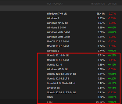 La distribuzione più utilizzata dagli utenti Steam per Linux è Ubuntu 12.10 64-bit con 0.71% a seguire la versione 32 bit con il 0.19% e Ubuntu 12.04 LTS 64-bit con il 0.31%.
